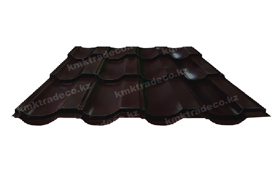 Металлическая кровля имеет максимальное сходство с натуральной черепицей. Листы изготовлены из тонколистовой стали толщиной 0.50 мм с МАТТ (матовым) покрытием премиум-класса – придаёт поверхности кровли необычный матовый «бархатистый» вид. Цвет – RAL 8017 Графитовый серый. Высота профиля – 25+/-1 мм.
